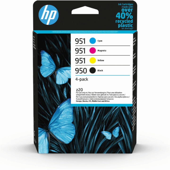 HP Original 950 Schwarz/951 Cyan/Magenta/Gelb Druckerpatronen, 4er-Pack. Tintenpatronenkapazität: Standardertrag, Schwarzer Tintentyp: Tinte auf Pigmentbasis, Farbiger Tintentyp: Tinte auf Pigmentbasis, Volumen schwarze Tinte: 24 ml, Versorgungstyp: Kombi-Packung, Seitenergebnis Farbtinte: 1000 Seiten, Volumen Farbtinte: 16,5 ml, Menge pro Packung: 4 Stück(e), Seitenergebnis schwarze Tinte: 1000 Seiten