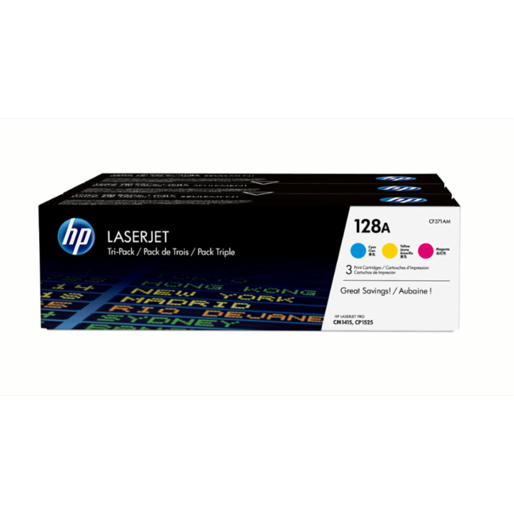 HP 128A 3er-Pack Cyan/Magenta/Gelb Original LaserJet Tonerkartuschen. Farbtoner-Seitenleistung: 1300 Seiten, Druckfarben: Cyan, Magenta, Gelb, Menge pro Packung: 3 Stück(e)