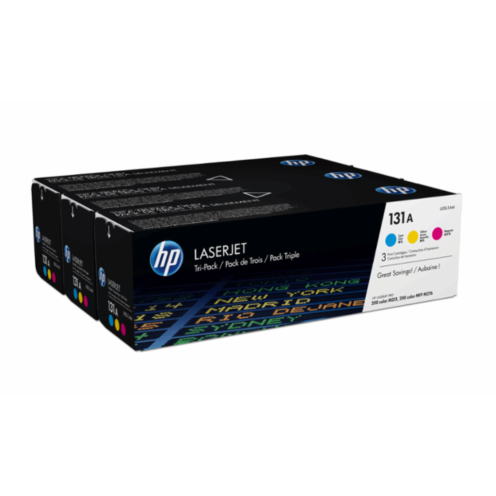 HP 131A 3er-Pack Cyan/Magenta/Gelb Original LaserJet Tonerkartuschen. Farbtoner-Seitenleistung: 5400 Seiten, Druckfarben: Cyan, Magenta, Gelb, Menge pro Packung: 3 Stück(e)